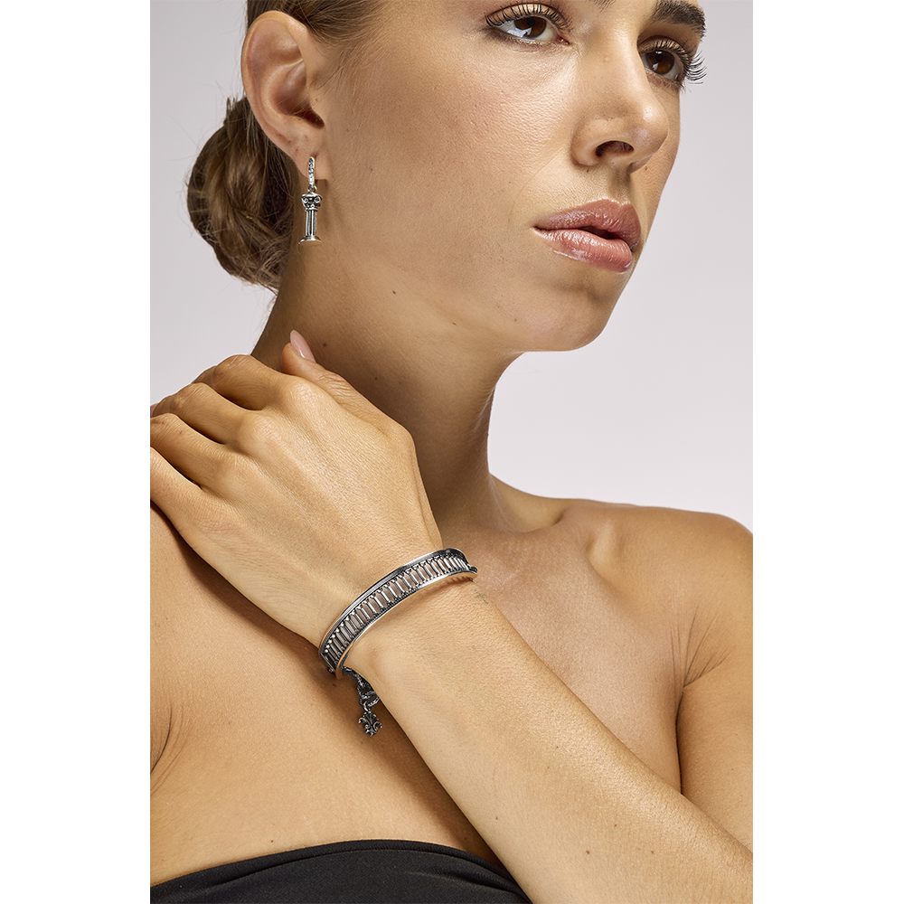 These earrings, made of hypoallergenic 925 silver, are embellished with white stones at the top. The columns, on the other hand, become linear and modern pendants.
