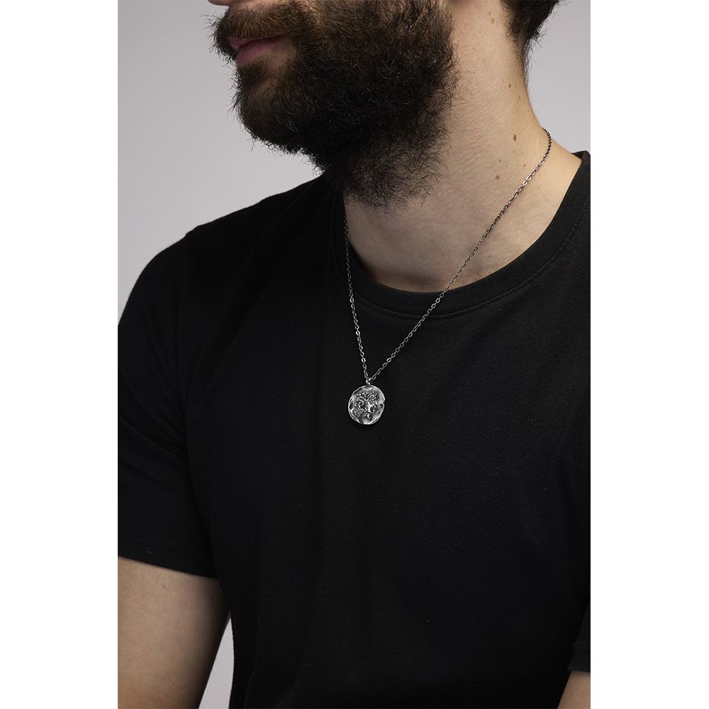 Il gioiello, realizzato a mano in argento 925, ha come ciondolo una placchetta con i due volti di Giano: uno che guarda al passato, l’altro al futuro.