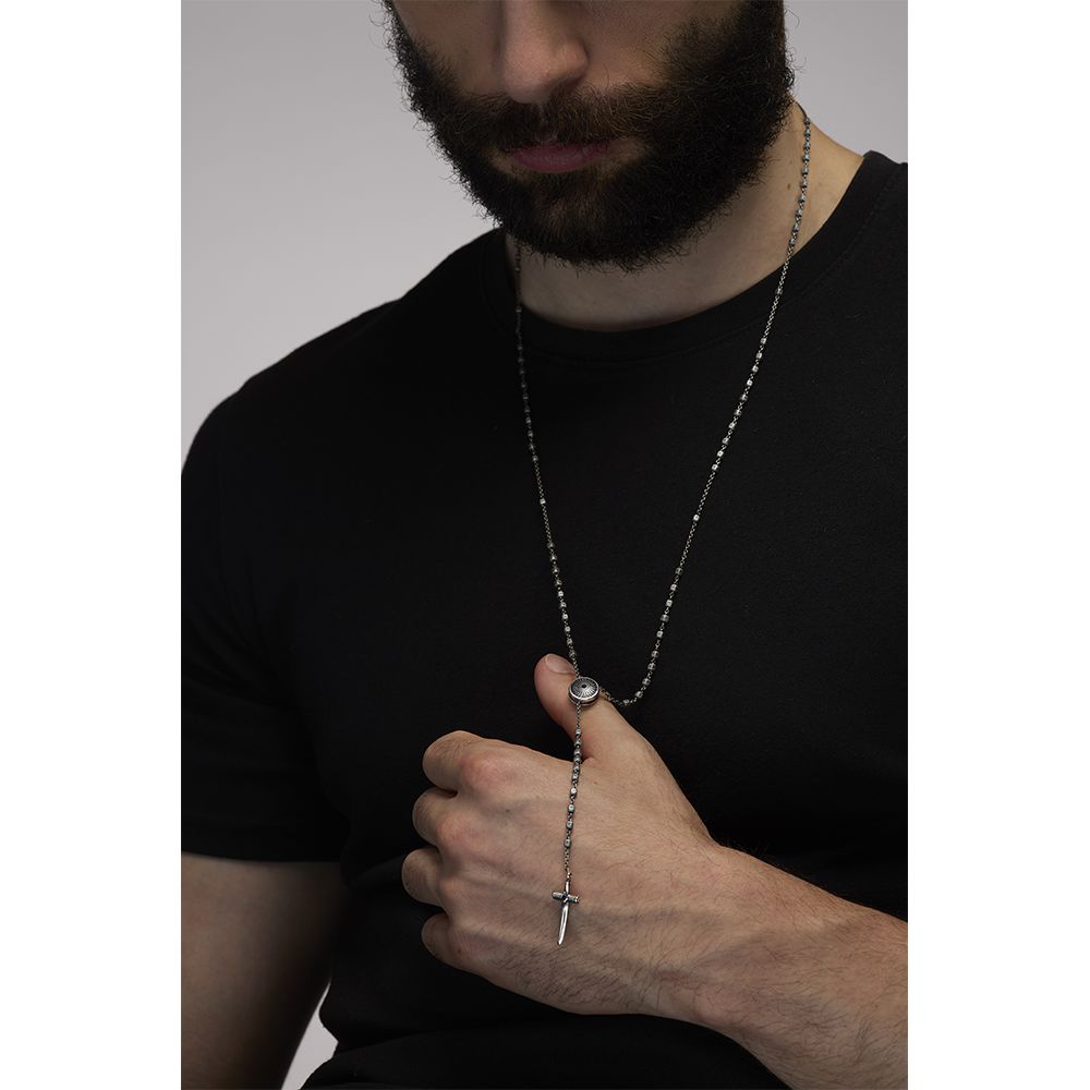 La collana, riporta assieme lo scudo e la spada. Lo scudo, famosa arma bianca usata nei secoli nelle battaglie come protezione e la spada invece come attacco. Ellius ha pensato questo gioiello per una persona forte e dinamica, pronta ad affronatre qualsiasi situazione, ma allo stesso tempo vulneraile. Realizzato a mano in argento invecchiato 925 e arricchito da piccole sfere, tipiche del rosario. Un gioiello unico per una persona speciale.